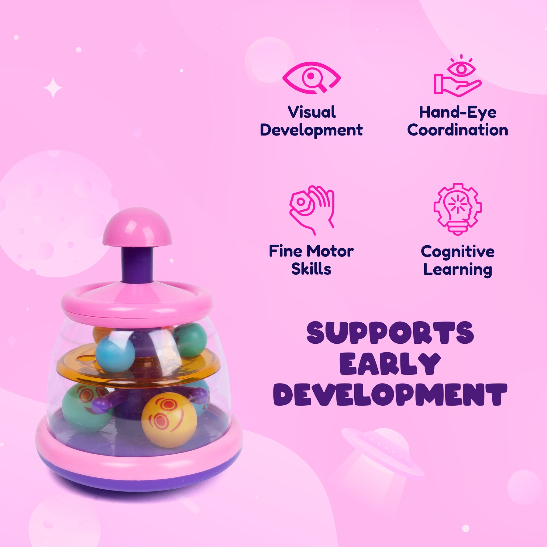 Keep your baby entertained and learning with the Colourful Spinning Balls Toy, designed for babies 6 months and older. This bright and engaging toy features vibrant spinning balls that captivate your little one’s attention while supporting key early developmental skills: