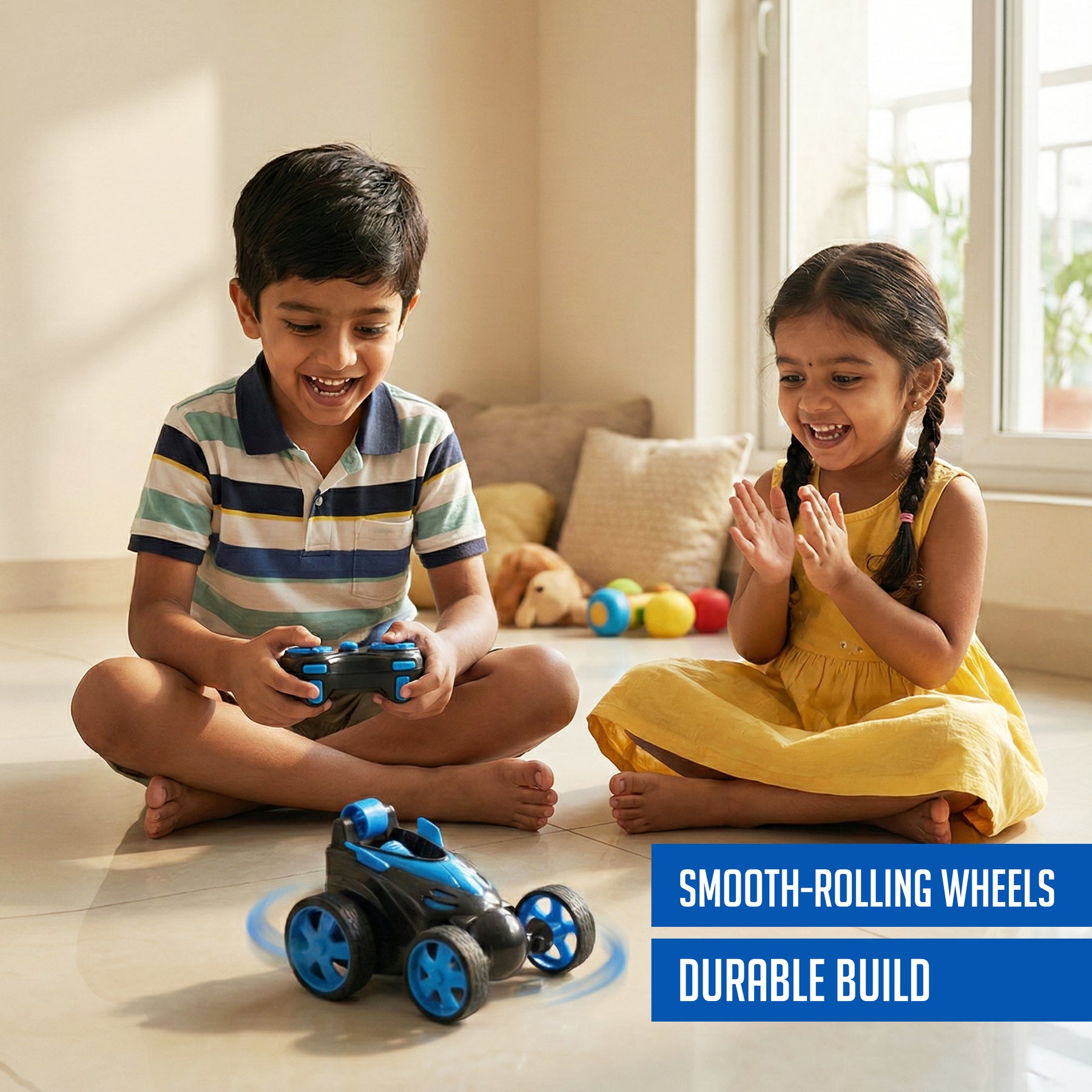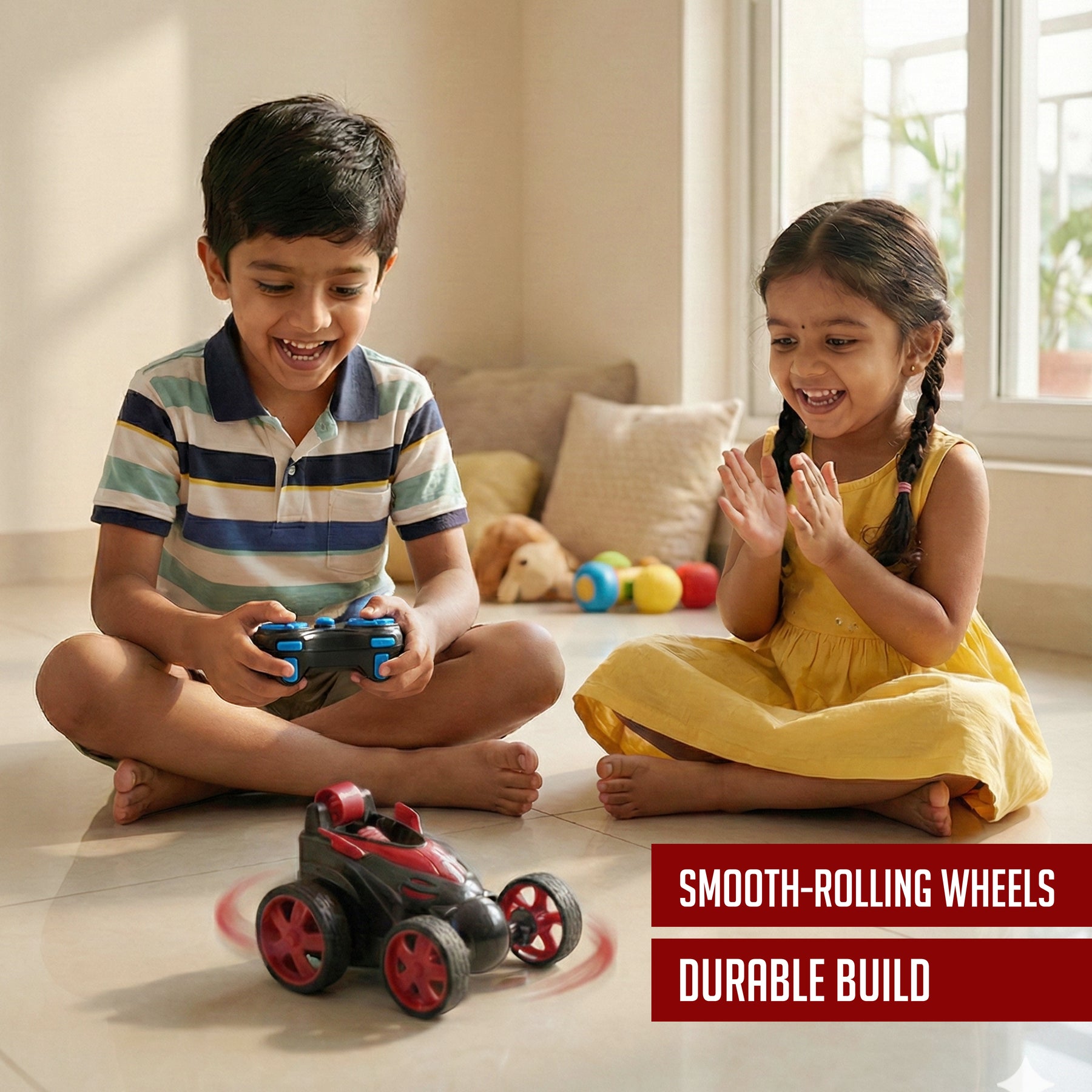 With a rugged four-wheel stunt design, this car easily handles flips, obstacles, rough terrain, ramps, and challenging surfaces. The smooth remote control lets kids steer, spin, and perform stunts confidently, improving hand–eye coordination, focus, and motor skills while keeping them fully engaged. Its durable, child-safe body ensures safe play during intense stunt action and exciting high-speed adventures, perfect for thrill-seeking little racers.