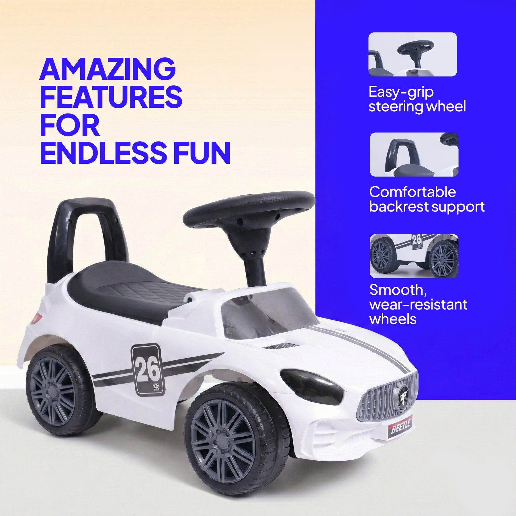 The wide, comfortable seat and supportive backrest help maintain proper posture while riding, ensuring a safe and enjoyable experience. Built with smooth, rounded edges and sturdy wheels, the ride-on glides easily on indoor and outdoor surfaces, offering stability and balance for young riders.